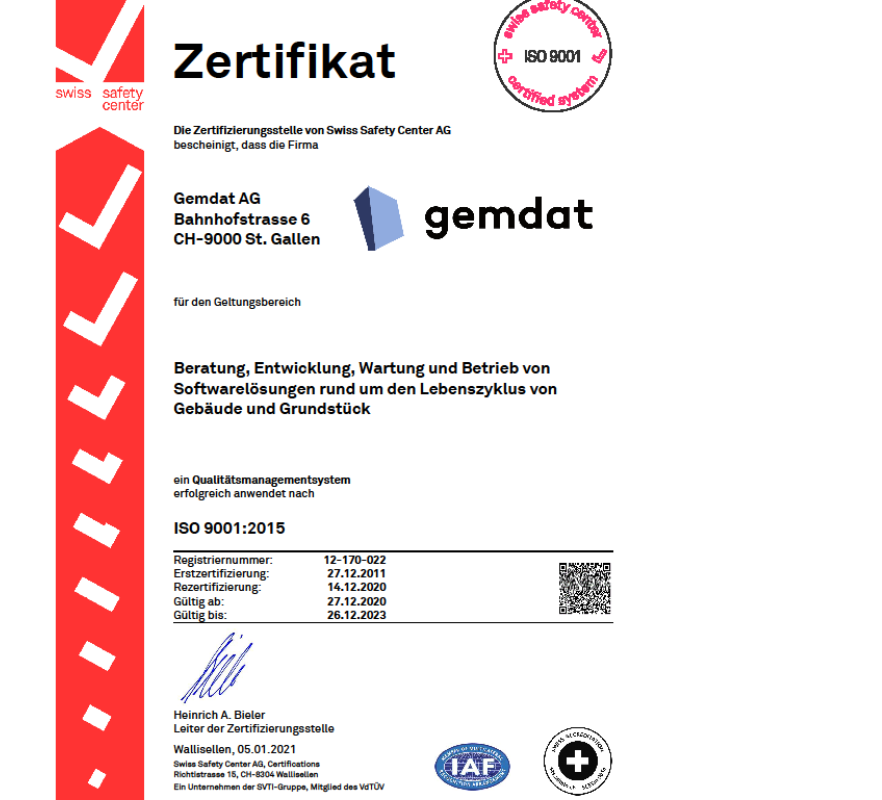 Gute Qualität ist das Ergebnis aus dem Zusammenspiel aller Abläufe, die die Mitarbeitenden aktiv in ihren Rollen und Verantwortlichkeiten wahrnehmen. Diese Zusammenarbeit wird intern laufend verifiziert. Im vergangenen Dezember fand eine neue Überprüfung durch den externen Auditor statt, die zur erfolgreichen Rezertifizierung des Gemdat Qualitätsmanagements nach ISO 9001:2015 führte.